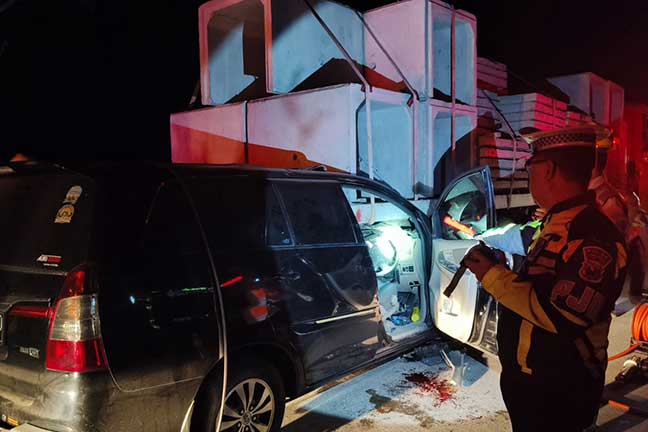 Sebuah minibus Toyota Innova dengan kecepatan tinggi menabrak bagian belakang truk pengangkut beton. Akibatnya, tiga orang meninggal dunia dan satu balita selamat dari maut.
